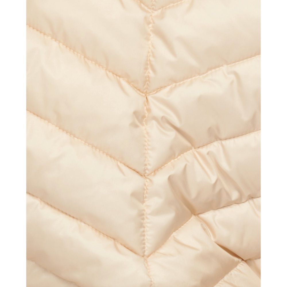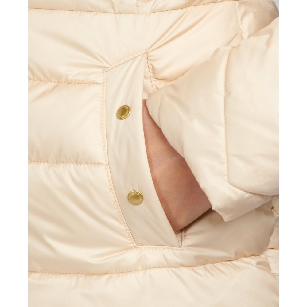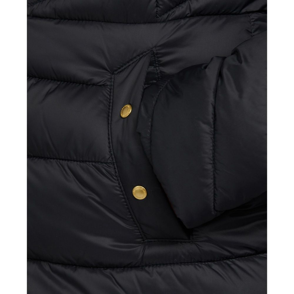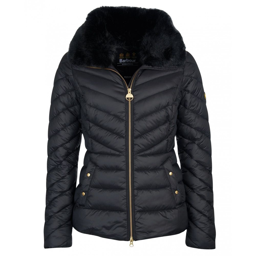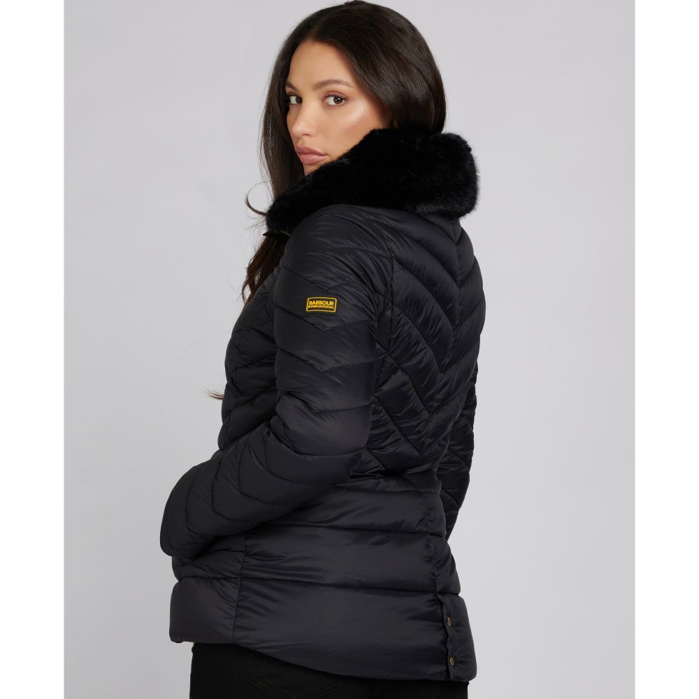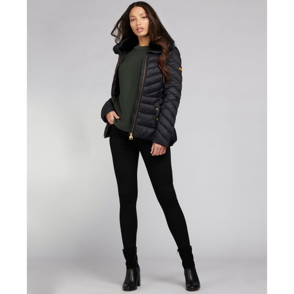 Product ID: LQU1361Constructed with chevron quilting through the body, this cosy jacket is cut to a flattering silhouette with a detachable fur funnel collar. It fastens through the centre front with an exposed two-way zip and is finished with double studded close welt pockets. The back shows off a studded centre vent and the look is finished off with the signature Barbour branding to the left sleeve.