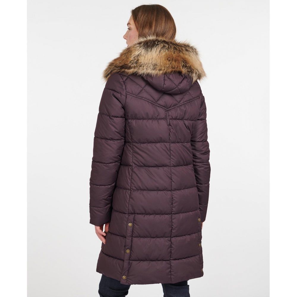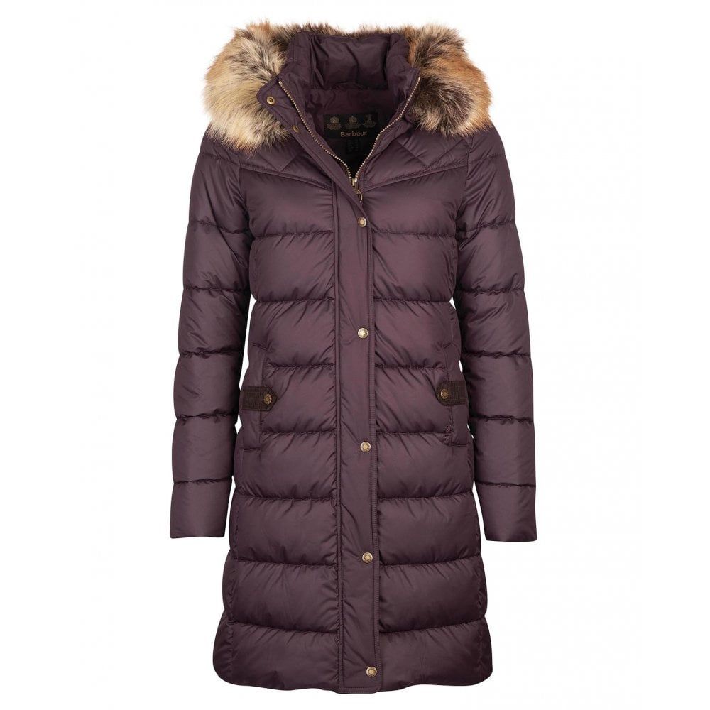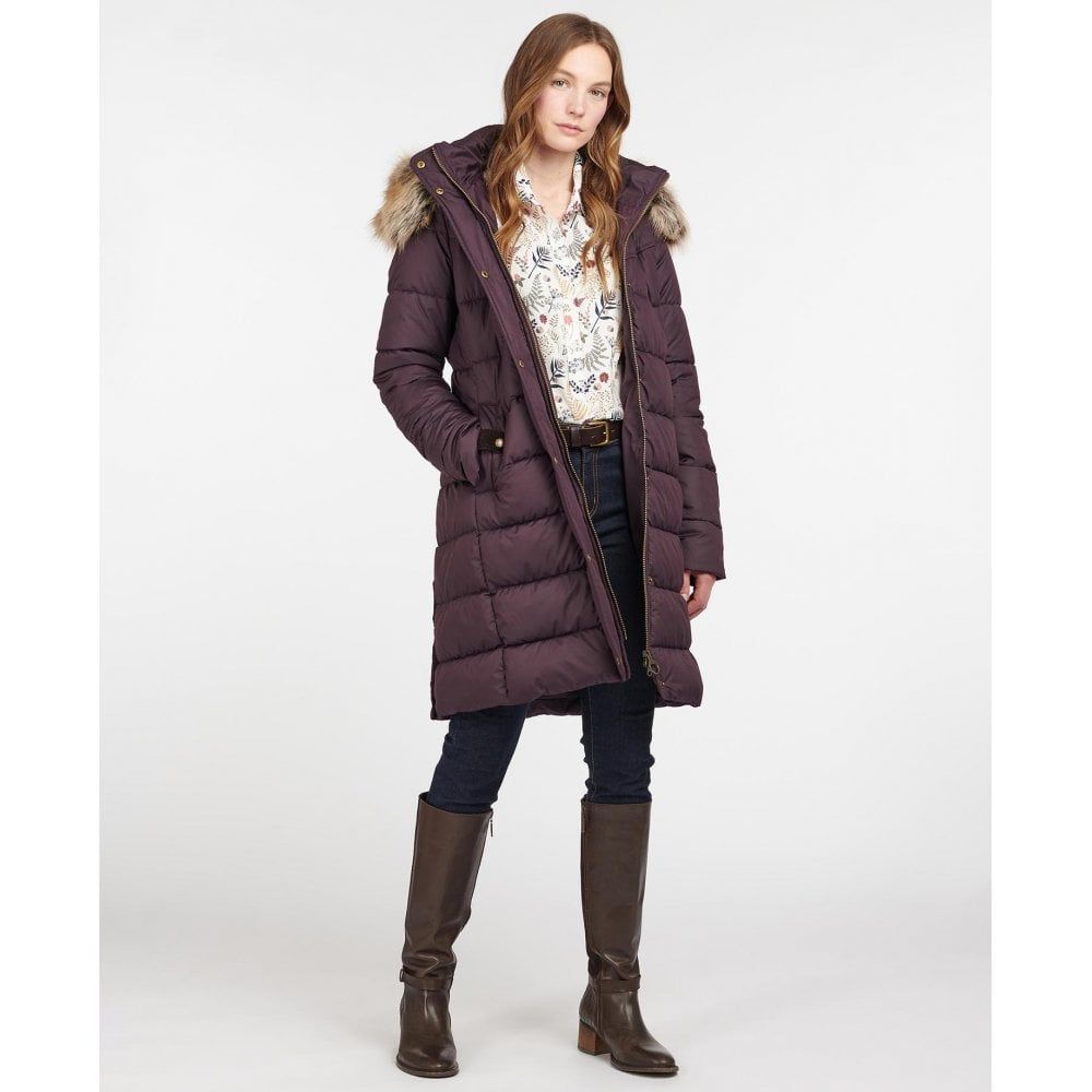 Product ID: LQU1358Introducing the Rustington Quilted Jacket, perfect for keeping you warm in cooler climates, this classic coat is warm and functional, with a luxurious feel. With a longline quilt style, this flattering slim fit coat features contrast detailing at the yoke panel, detachable soft faux fur hood, cord detailing, and signature Barbour Branding on the left pocket.