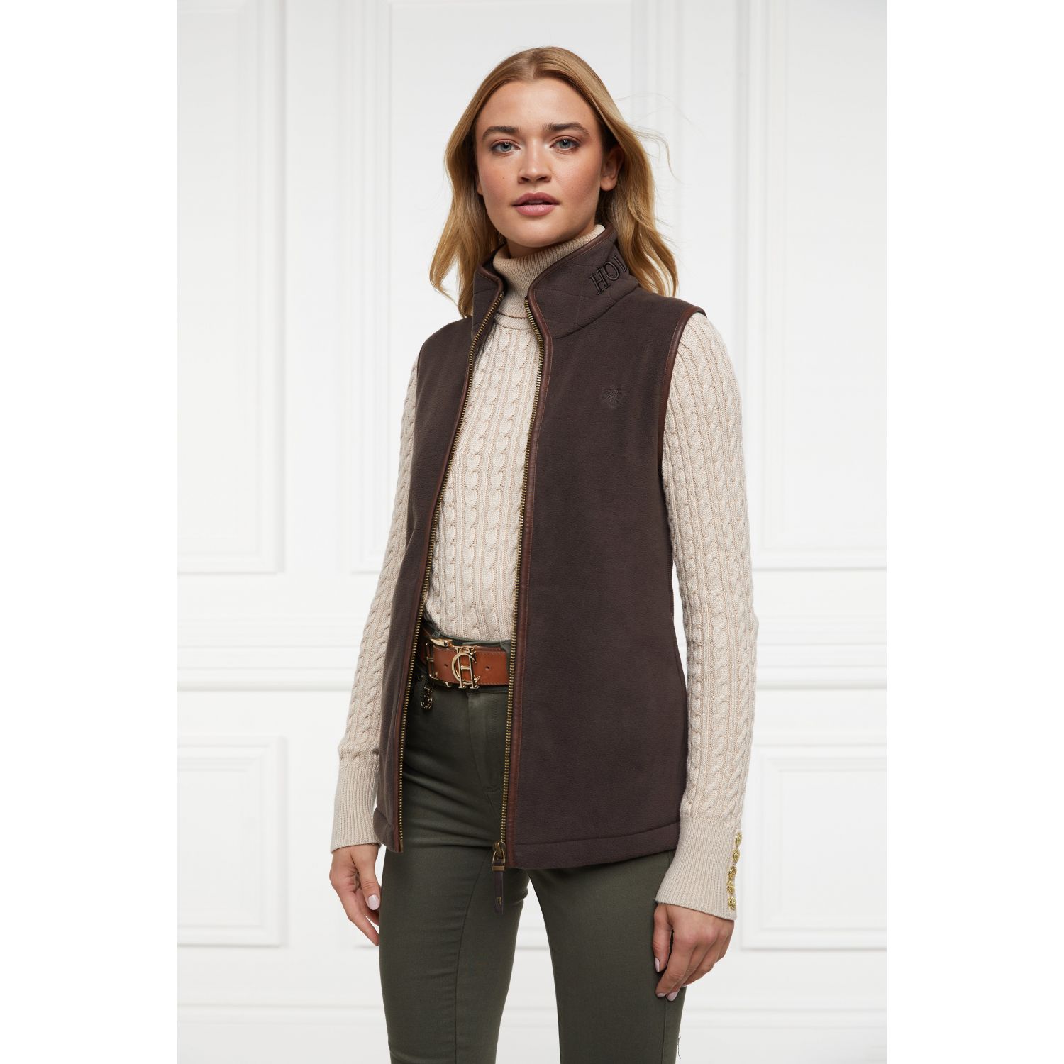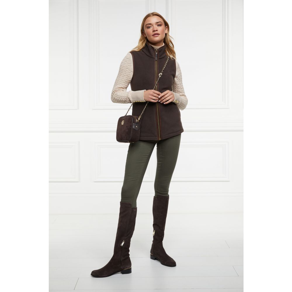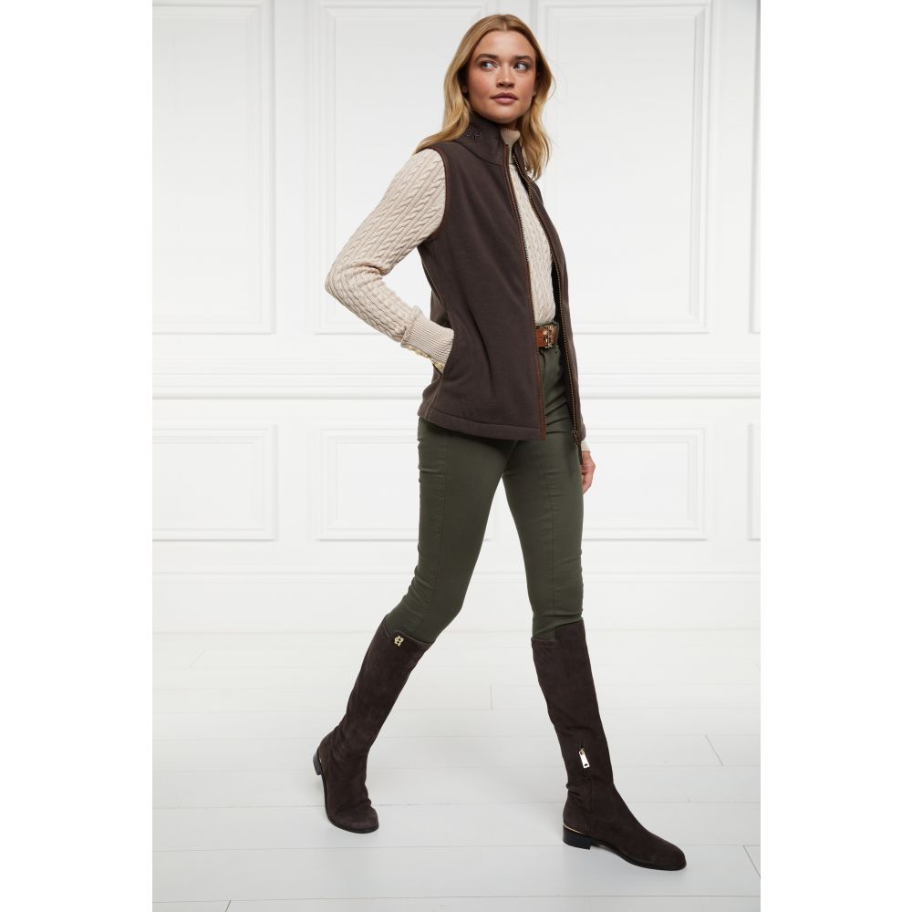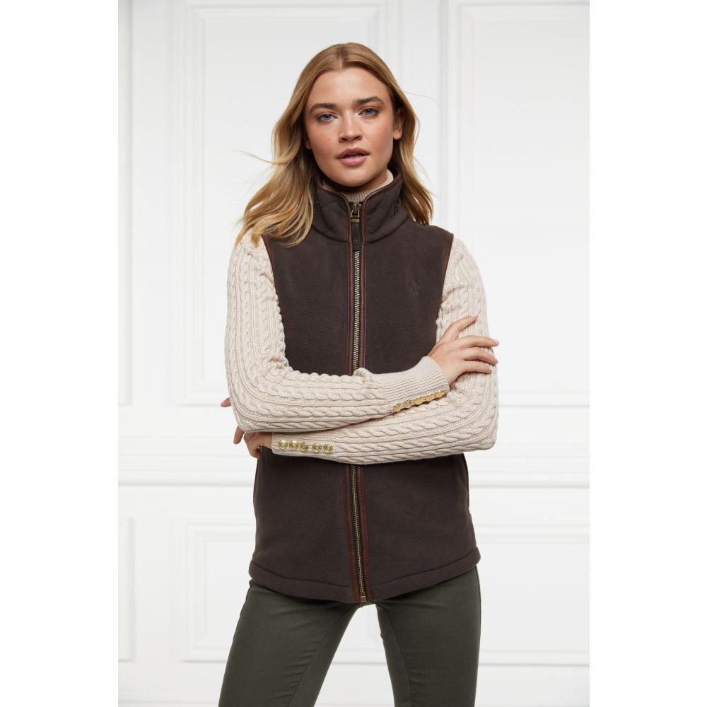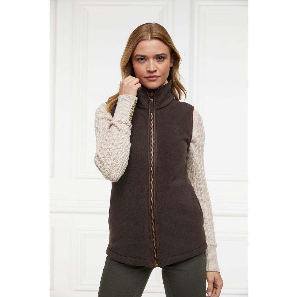 Product ID: 12100124081679This country style gilet is made from a technical polar fleece fabric designed to keep you warm on cold days. Perfect for layering, it is detailed with faux leather piping and finished with Holland Cooper's antique brass fastenings and metal hardware.