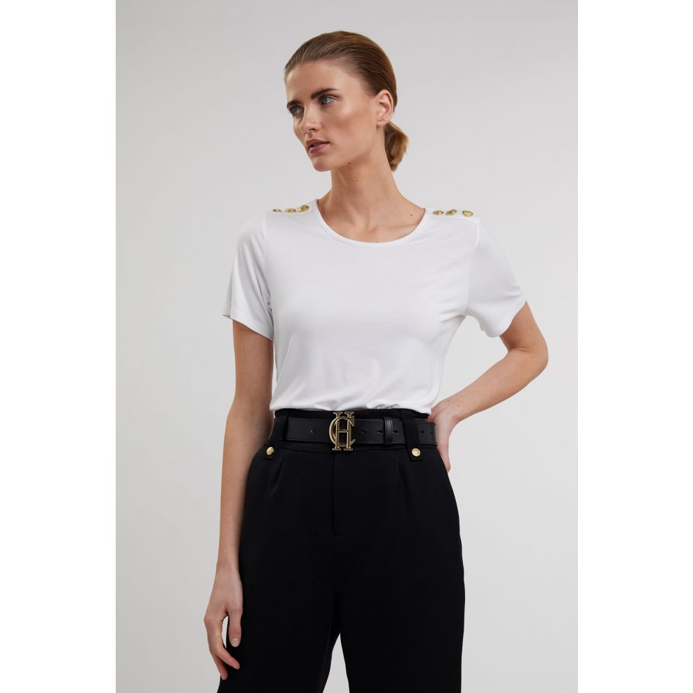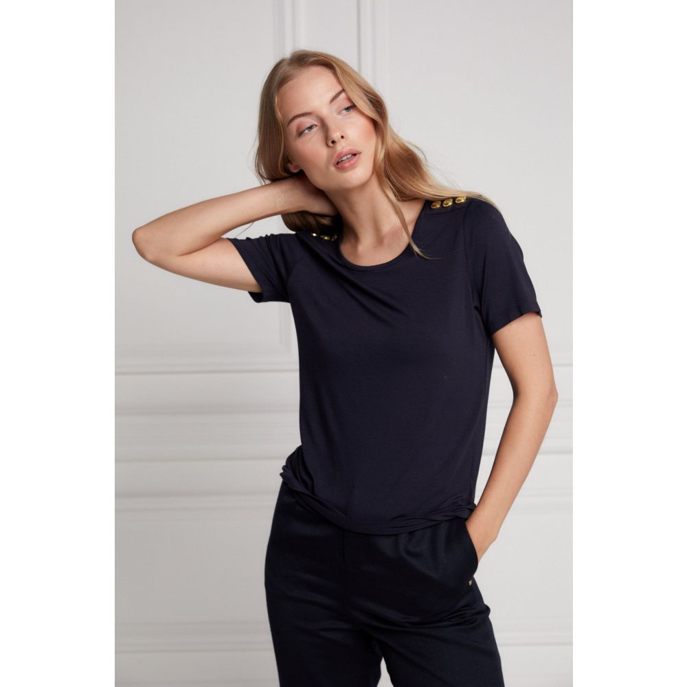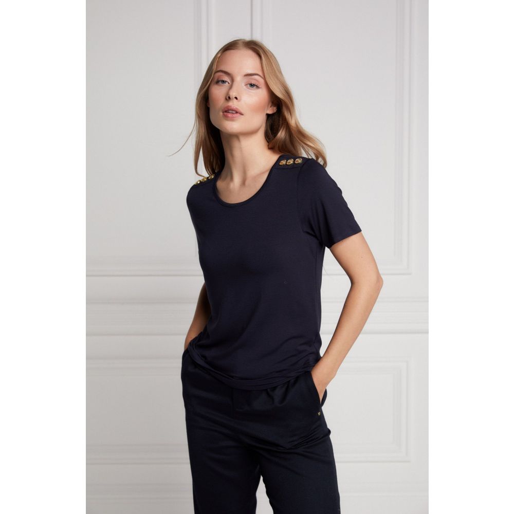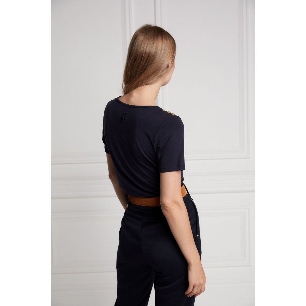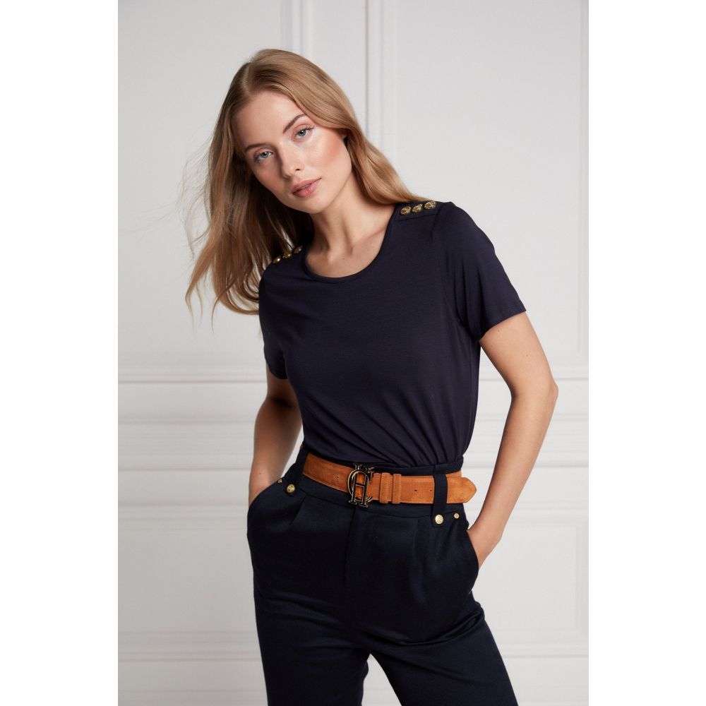 Product ID: W026ESCTEEA trusty well made t-shirt is a timeless wardrobe staple. Made from the softest fabric, it falls effortlessly down the body creating and ultra flattering look and feel. Designed for a chic relaxed fit, it can still be tucked neatly into high-waisted pants. Detailed with Holland Cooper's equestrian branding and finished with signature hardware on the shoulders.