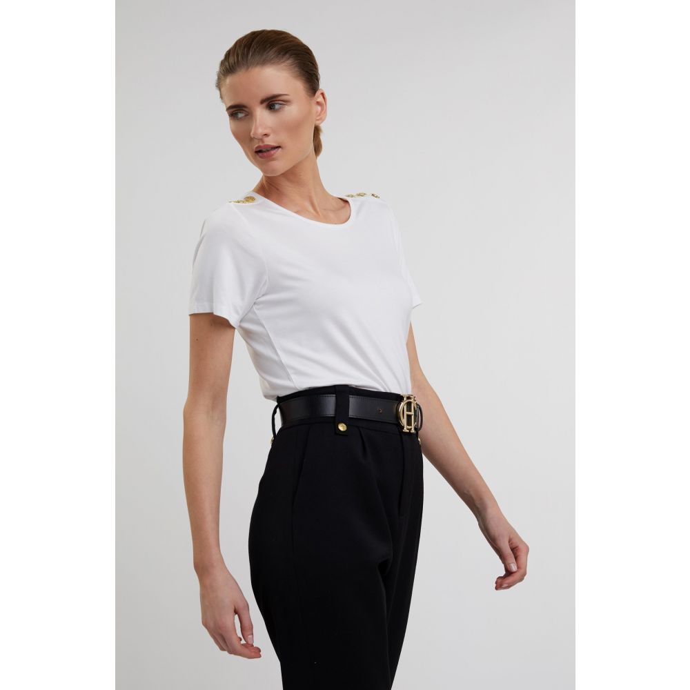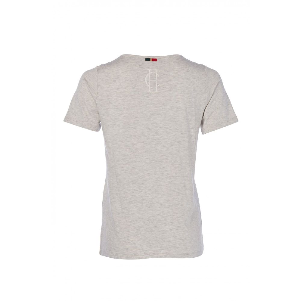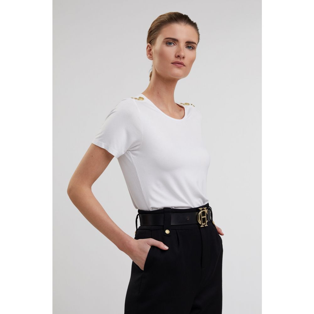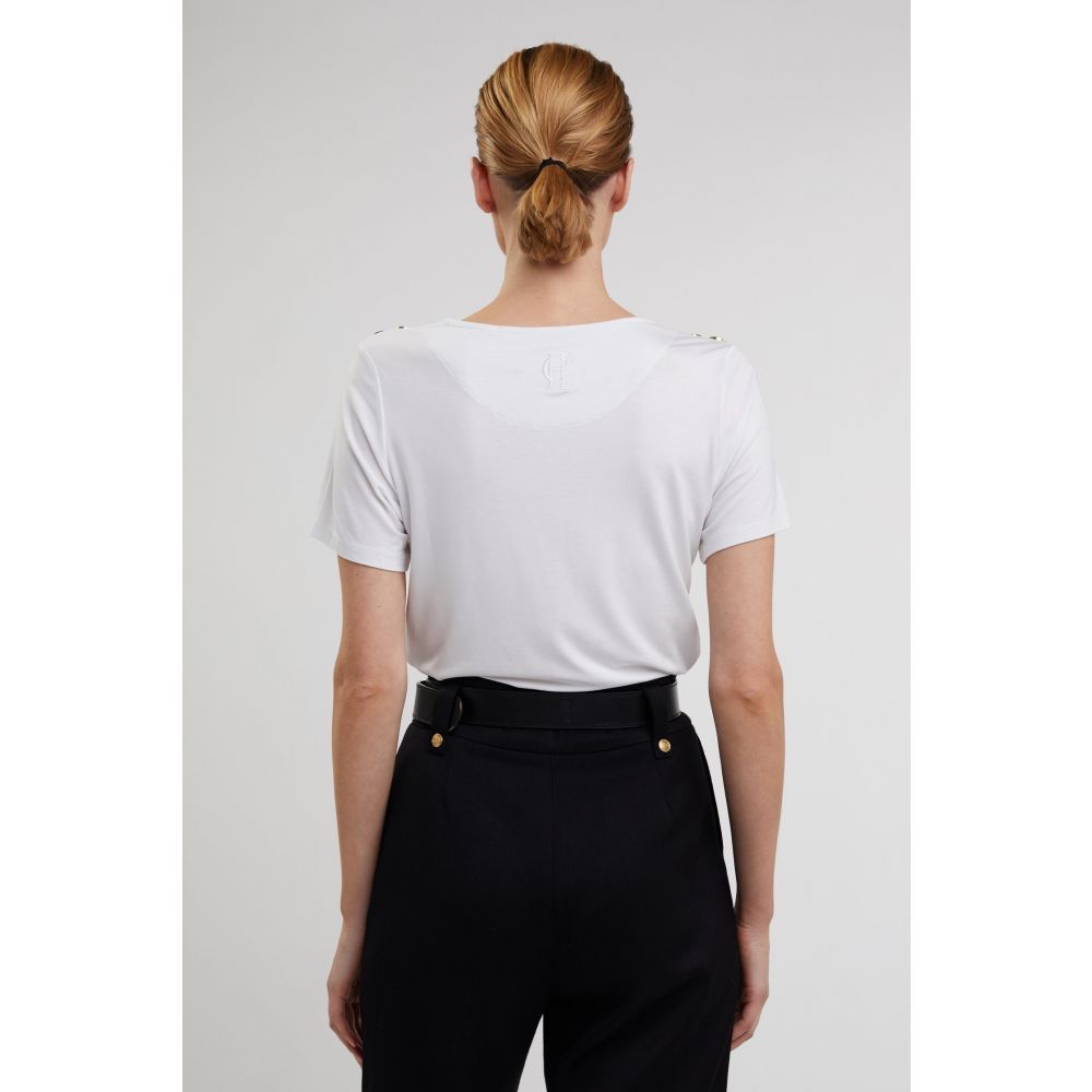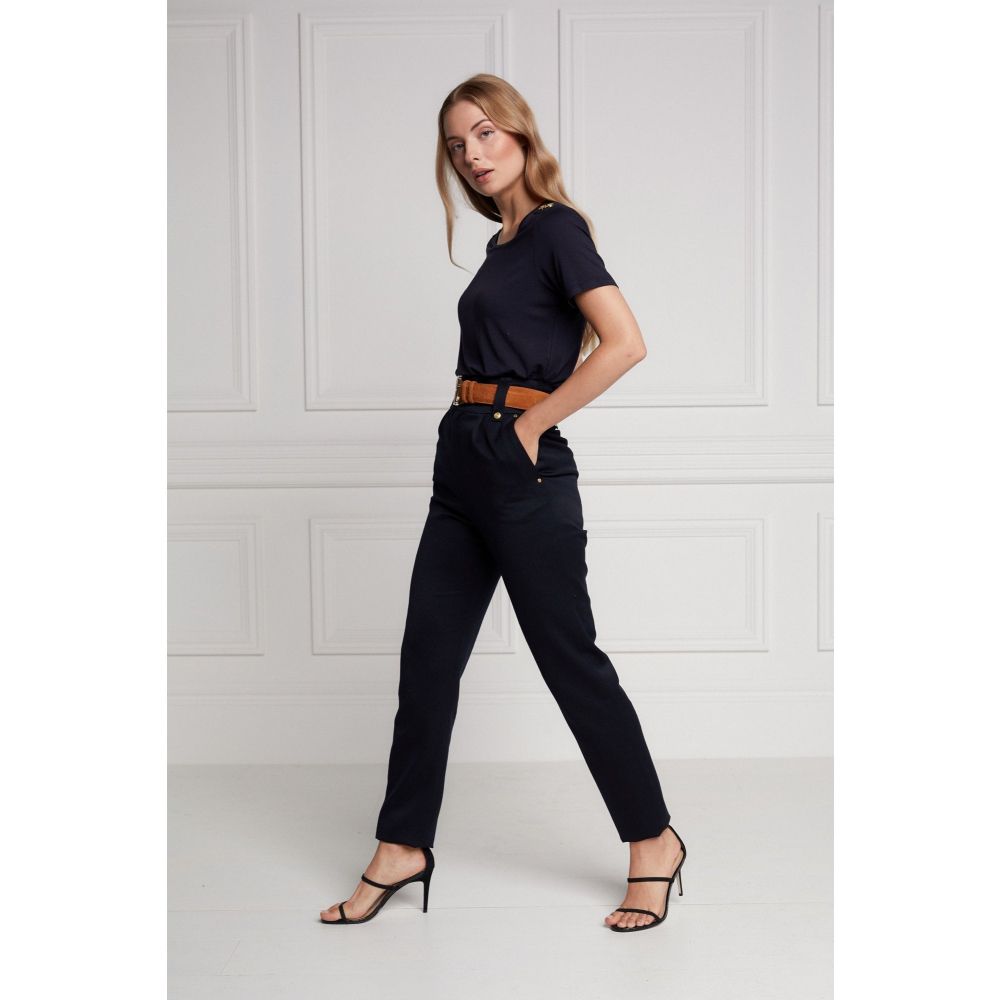 Product ID: W026ESCTEEA trusty well made t-shirt is a timeless wardrobe staple. Made from the softest fabric, it falls effortlessly down the body creating and ultra flattering look and feel. Designed for a chic relaxed fit, it can still be tucked neatly into high-waisted pants. Detailed with Holland Cooper's equestrian branding and finished with signature hardware on the shoulders.