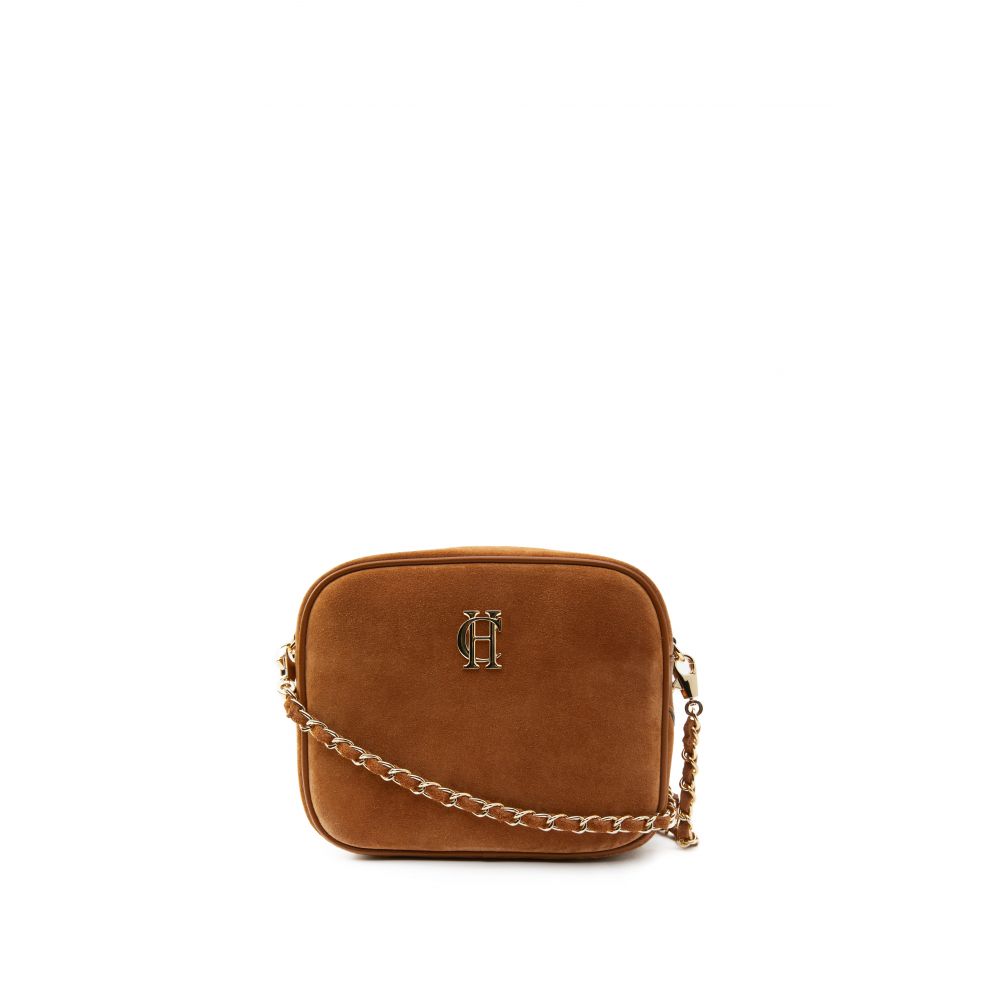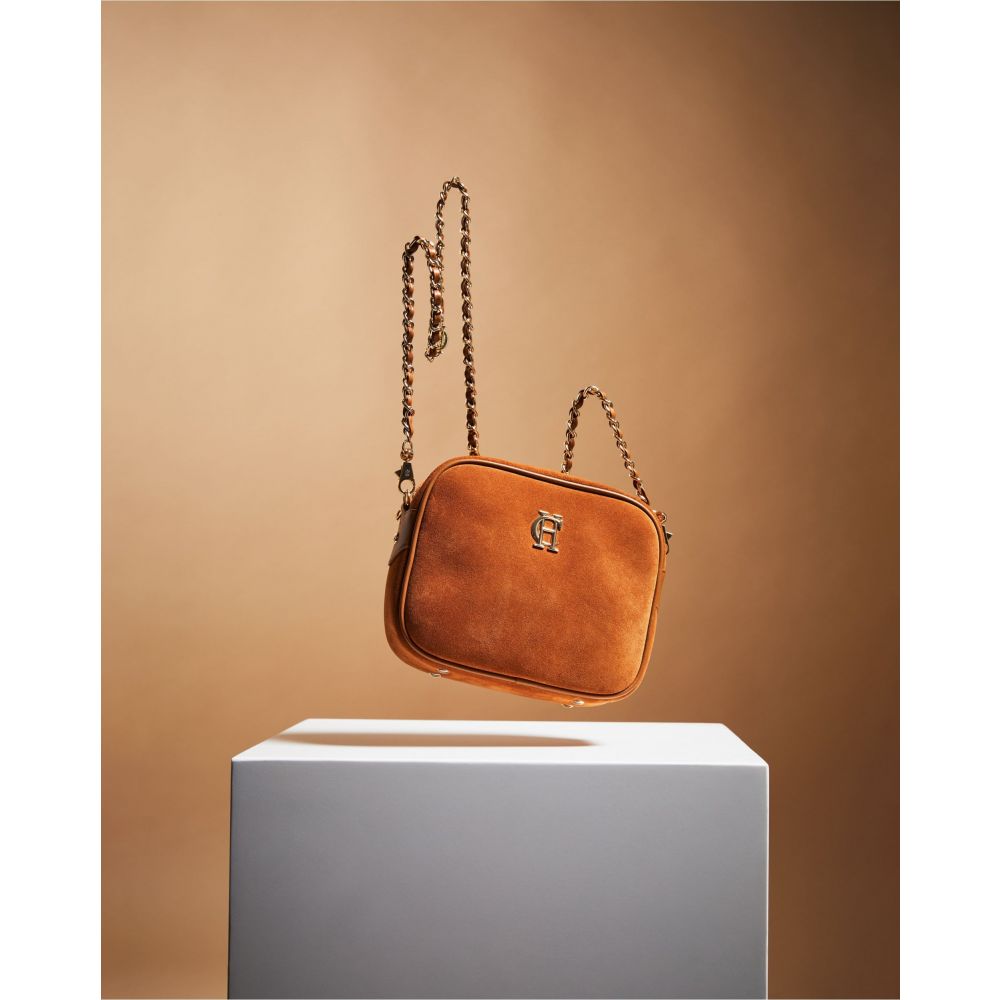 Designed with a classic camera bag shape from premium suede with leather detailing, this bag has been created with a sleek compact profile for ensuring your valuables are kept safe. With an elegant chain shoulder strap with HC trim & bold HC logo to the front.